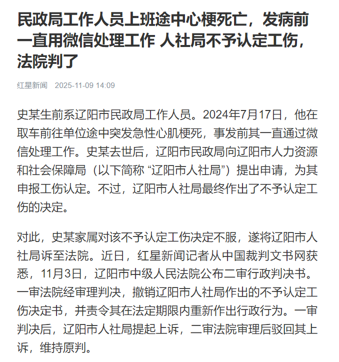 案件进入司法程序后,辽阳当地法院将微信聊天记录、当事人工作单位出具的情况说明等纳入核心证据链,明确指出“对职工工作时间及工作岗位的确定,不应必然拘泥于固定的上班时间、地点的限制”,整体获得舆论认可,被赞是“司法为民”的典范。