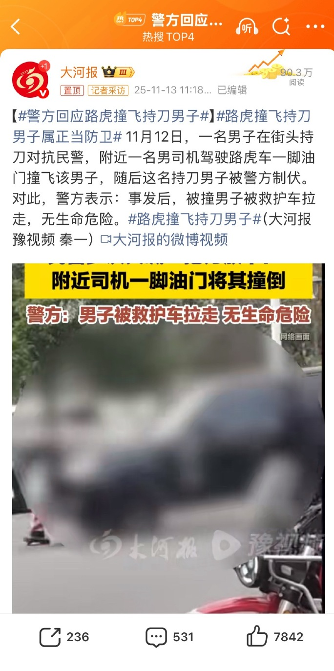 截至11月17日14时,相关信息量全网相关信息1.4万余条,微博话题“#路虎司机撞翻持刀男算不算见义勇为#”“#路虎撞飞持刀男子属正当防卫#”累计阅读量7000万,先后登上热搜榜。