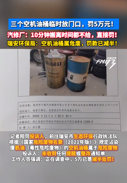 11月4日,据温州市新闻传媒中心《温州晚间报道》栏目报道,温州瑞安一汽修店负责人彭先生求助称,近日因厂里地面做地坪漆,临时将三个空机油桶挪到门口,11月1日瑞安市生态环保行政执法队到店检查,当场对此定性为“随意摆放危险废物”,直接通知要对该违法行为处罚5万元,执法人员称“签字认罚5万、不签字则罚10万”。彭先生认为处罚过重,无法接受。