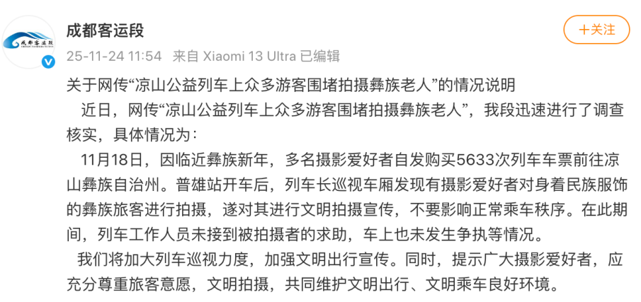 11月24日12时许,“@成都客运段”发布情况说明称,因临近彝族新年,近日多名摄影爱好者乘坐5633次列车前往凉山彝族自治州。普雄站开车后,列车长巡视车厢发现有摄影爱好者对身着民族服饰的彝族旅客进行拍摄,遂对其进行文明拍摄宣传,不要影响正常乘车秩序。在此期间,列车工作人员未接到被拍摄者的求助,车上也未发生争执等情况。今后将加大列车巡视力度,加强文明出行宣传。