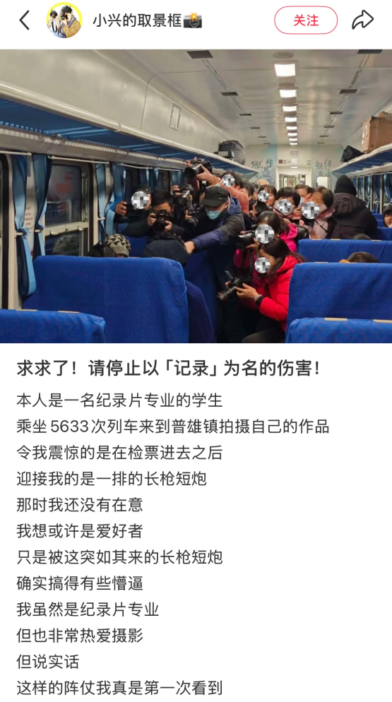 11月19日20时许,小红书网民“@小兴的取景框”发帖称,自己在乘坐5633次列车前往普雄镇的途中,在车厢内遇到一摄影团手持“长枪短炮”不停走动,并不顾被拍摄者意愿围着一个人拍摄,呼吁停止以“记录”为名的伤害,不少网民留言认为这是冒犯被拍摄者的“镜头霸凌”行为。