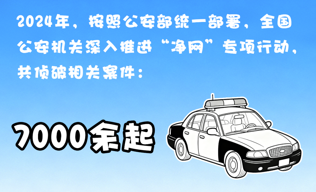 2024年,按照公安部统一部署,全国公安机关深入推进“净网”专项行动,始终保持对侵犯公民个人信息犯罪的高压严打态势,紧盯信息获取、信息倒卖、信息使用等关键环节,重拳捣毁一批个人信息交易平台。全年,共侦破相关案件7000余起,抓获一批犯罪嫌疑人。