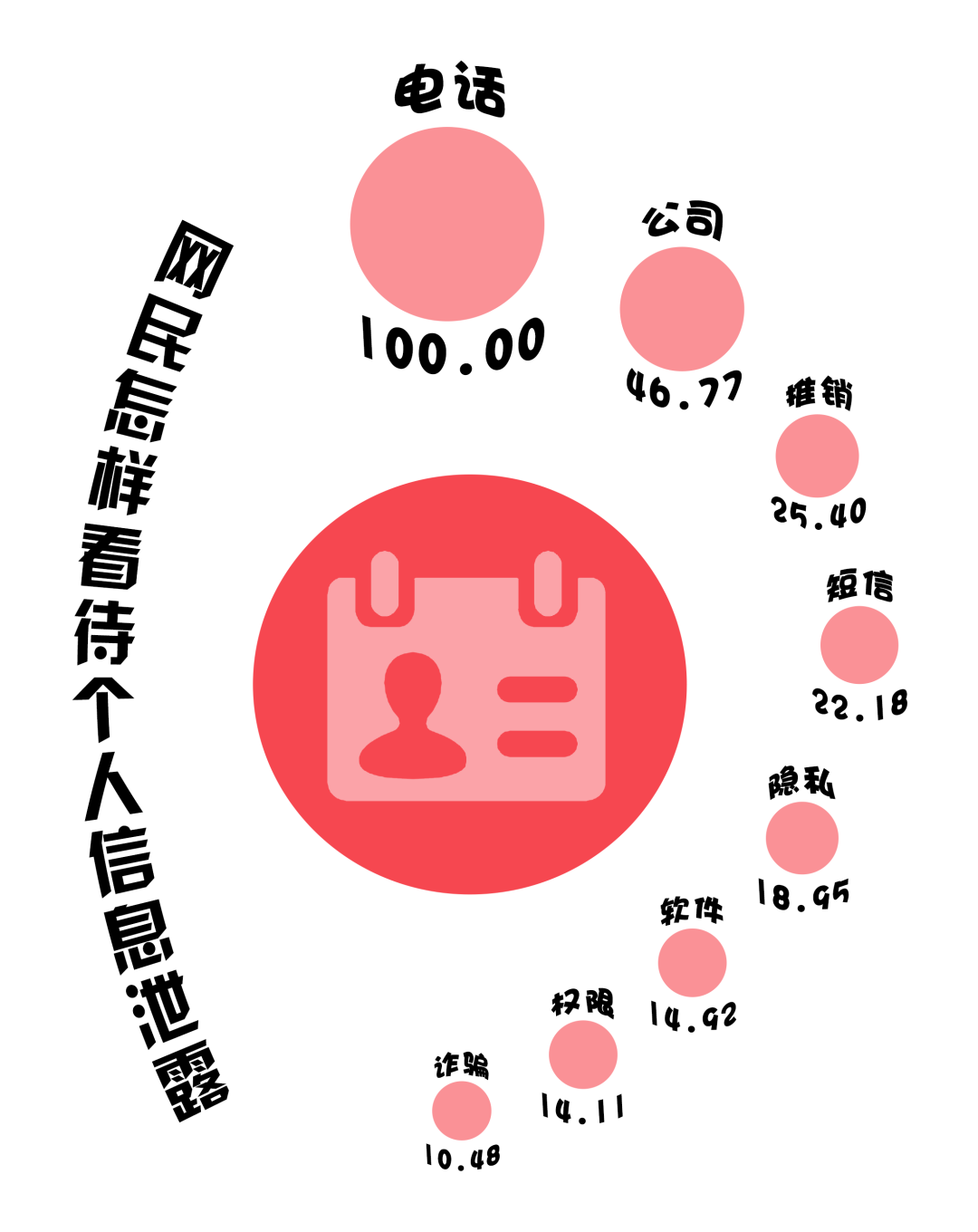 (数据来源:选取哔哩哔哩视频《可怕!这7家科技公司盗取身份证信息,4.68亿个人信息泄露》下的931条一级评论,做分词及归一化处理,进行分词后将热度最高的词语规定为100)