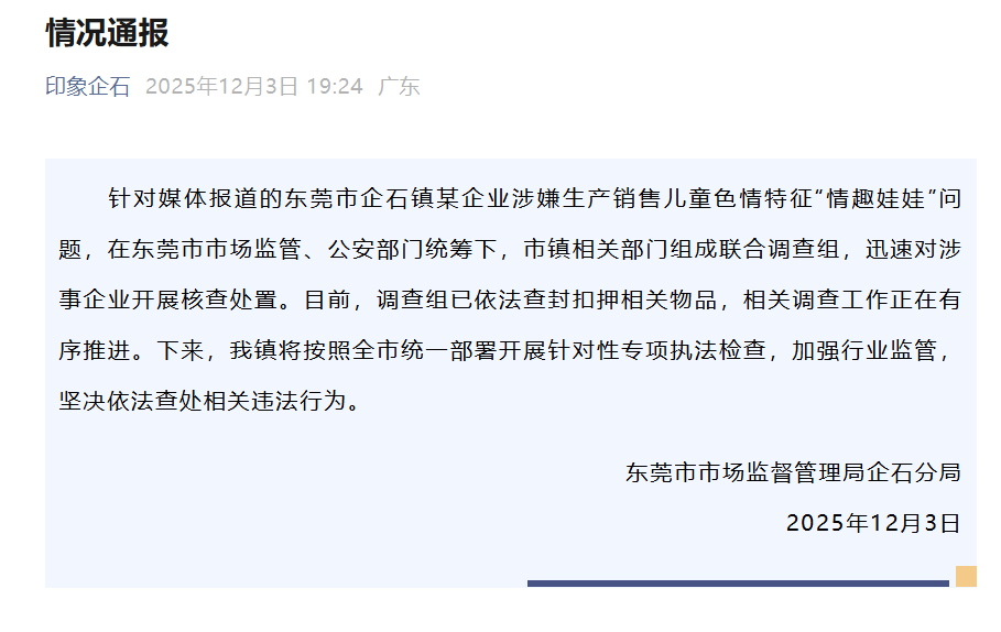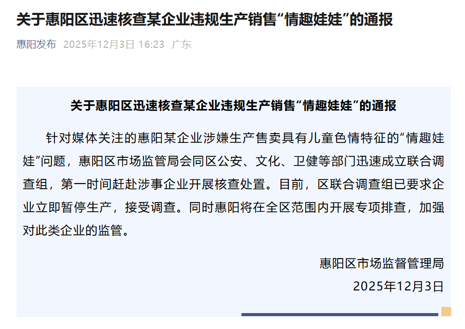 12月3日上午,广东惠州惠阳区市场监督管理局一名工作人员表示,针对报道披露的事件,惠阳区相关领导高度重视,已召集多部门进行联合研判。3日下午,惠阳区市场监督管理局发布情况通报,已会同区公安、文化、卫健等部门迅速成立联合调查组,要求企业立即暂停生产,接受调查,同时将在全区范围内开展专项排查。3日下午,上海市奉贤区市场监督管理局一名工作人员表示,针对此事,正在调查中。3日晚间,东莞市市场监督管理局企石分局通报称,在东莞市市场监管、公安部门统筹下,市镇相关部门组成联合调查组,目前已依法查封扣押相关物品,接下来将按照全市统一部署开展针对性专项执法检查。