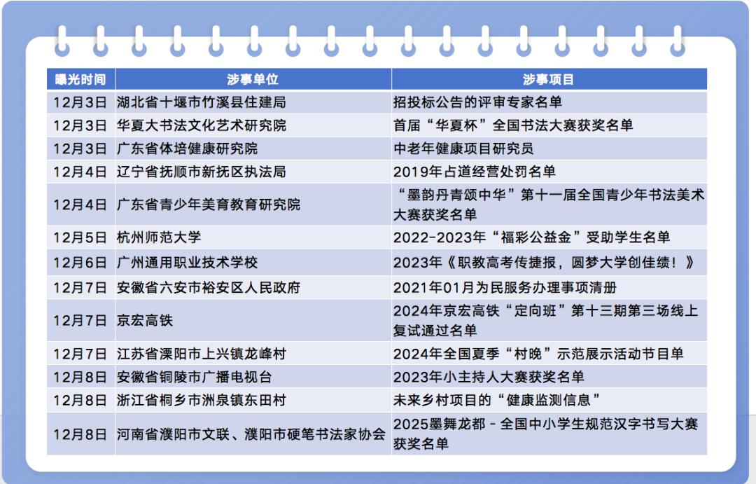 截至12月9日15时,全网相关信息达10万余条,“#全网最忙五人组背后谁在造假#”“#人民日报评最忙五人组反复跨界#”“#职校高考喜报与人名大全高度重合#”“#该让全网最忙五人组歇歇了#”“#公益项目受助名单照搬人名大全#”“#政府采购评审名单被指照搬人名大全#”“#新华社调查栏目追问最忙五人组#”“#安徽一政务清单被指照搬人名库#”“#政府文件还要薅多少人名大全#”“#最忙五人组还是多项专利发明人#”“#全网最忙五人组造假装都懒得装了#”“#全网最忙五人组#” 等十多个词条登上热搜榜,阅读量超7亿次。