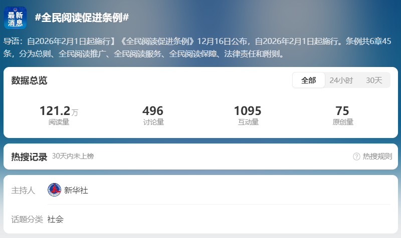 截至12月19日14时,全网相关信息1.9万余条。“#全民阅读促进条例#”“#全民阅读促进条例将于明年实施#”“#中小学应开设阅读课程与辅导#”“#鼓励车站等公共场所设阅读设施#” 等微博话题阅读量累计超2854.3万。