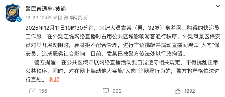 12月20日,上海市公安局黄浦分局官方微博“@警民直通车-黄浦”发布警方通报称,2025年12月11日10时30分许,来沪人员袁某(男,32岁)身着网上购得的快递员工作服,在外滩江堤网络直播时占用公共区域影响游客通行秩序。外滩风景区保安员对其开展劝阻时,袁某拒不配合管理,进行言语挑衅并煽动直播间观众“人肉”保安员,造成恶劣社会影响。目前,袁某已被警方依法处以行政拘留。