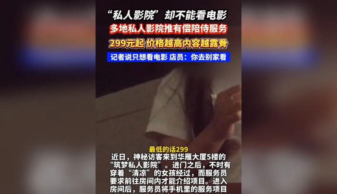 12月19日,江苏广电总台荔枝新闻中心《神秘访客》发布暗访报道,揭露西安、成都、三亚等多地私人影院出现有偿陪侍等违规服务。其中,西安“筑梦私人影院”强制顾客选购陪侍套餐,相关项目名称露骨;成都“云水谣私人影院”地址虚假,隐蔽提供有偿陪侍及“擦边”游戏服务;三亚贝贝私影俱乐部的简介中,详细列明了各种服务以及对应的报价,价格越高,内容越露骨。