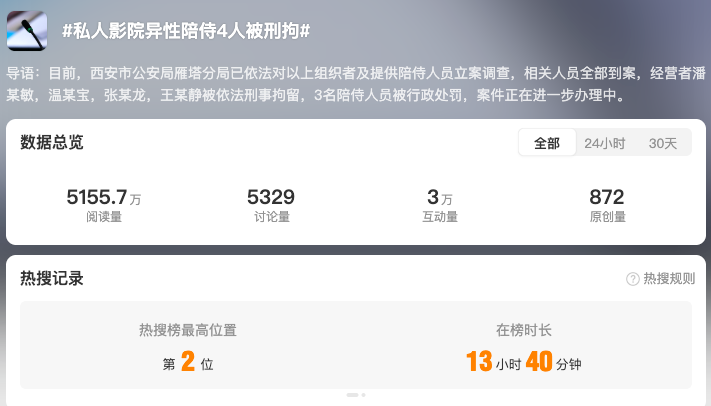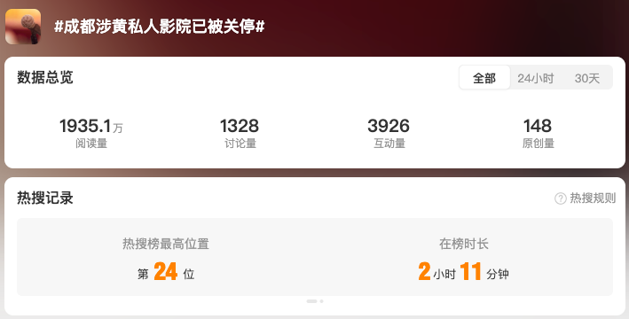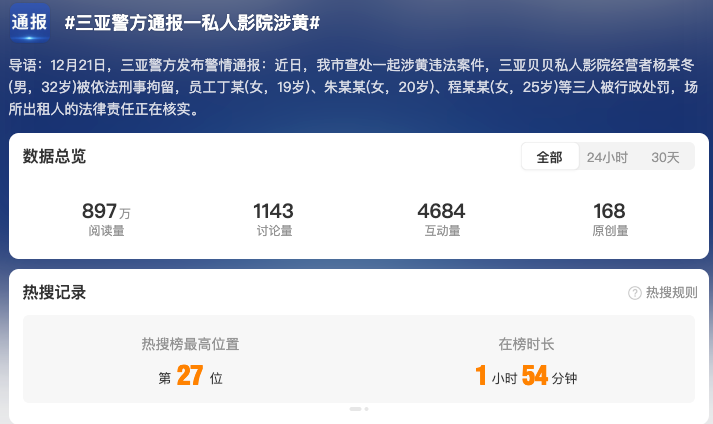 截至12月24日17时,全网相关信息2.7万余条。“#私人影院强制要求顾客选择异性陪侍套餐#”“#私人影院异性陪侍4人被刑拘#”“#成都涉黄私人影院已被关停#”“#涉黄私人影院3名00后女员工被罚#” 等微博话题阅读量累计超1.6亿。