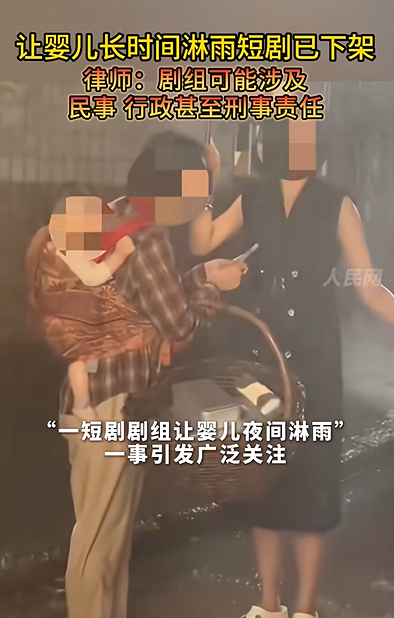 1月17日,短剧女演员邢昀发文吐槽“短剧剧组让婴儿夜间淋雨半小时”,帖文中称,“夜里拍雨戏特别冷,洒水车那种瓢泼大雨,打伞也难以遮住,孩子被淋了好久,哭得撕心裂肺!”她还透露,拍近景时演员脸上不能有雨,所以伞不能放低,最好的解决办法是拍主角镜头时把孩子换成假孩子,但是剧组为了节约时间就没有换。随后“#婴儿淋雨拍短剧#”话题登上热搜榜第2位。据九派新闻、红星新闻等媒体跟进报道,该场戏婴儿的片酬仅800元,部分家长因经济压力接受此类拍摄。目前该微短剧已全平台下架。
