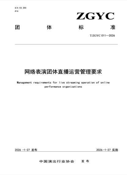 1月27日,中国演出行业协会正式发布《网络表演团体直播运营管理要求》(T/ZGYC 011—2026)团体标准(以下简称标准),抖音、快手、无忧传媒等平台及MCN机构参与起草。