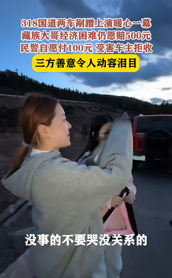 4月14日,央视新闻跟进采访,民警扎西旺堆谈到自己提出垫付100元时说:“当时也没多想,了解到藏族大哥家里确实困难,心里挺着急的。”他坦言,执法不仅要有力度,也要有温度,就想自己出一部分钱,先把事情解决了。“只要我们真心实意为群众办实事,群众之间也能多理解和包容。”藏族大哥的诚信担当、自驾游客的包容善良、民警的暖心举动,正是三方的善意在318国道上交汇,化解了这场小小的剐蹭事故。同日,博主“一鹤在摸鱼”再发视频称,其所在公司将承担租车费用并发放奖金5000元,后续将用这笔奖金去帮助藏族大哥,目前正在积极联系。“西藏剐蹭事故当事女子回应”登上抖音热榜。