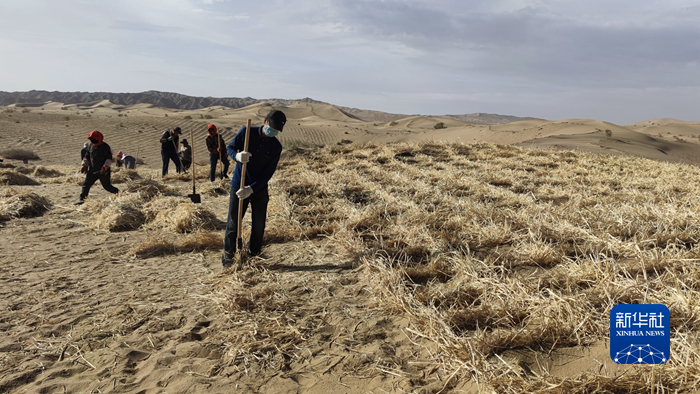 划线、码放、压草……在离崖面约1公里的地方,年小艳和工友们在专业技术人员的指导下学习扎设麦草方格。“四周铺草的地方高一点,中间凹下去,像鸡窝一样。”年小艳说。