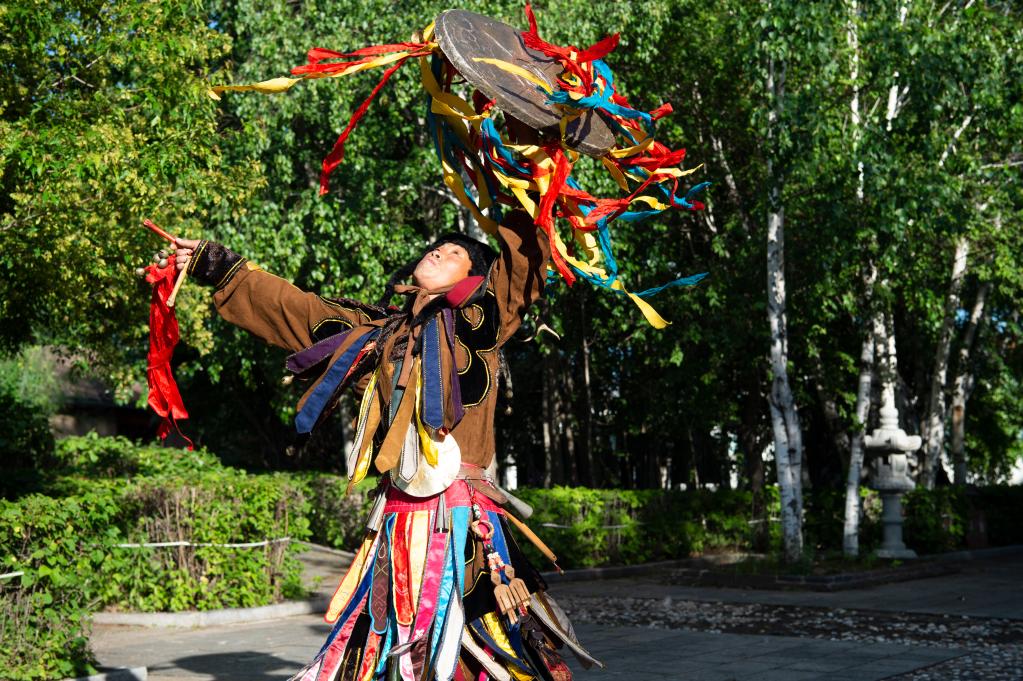 赫哲族信奉萨满文化。今年49岁的尤雪松是萨满第五代传承人,他身着鹿皮制作的衣服,手持鼓,伴随清脆的声响为游客表演传统舞蹈。