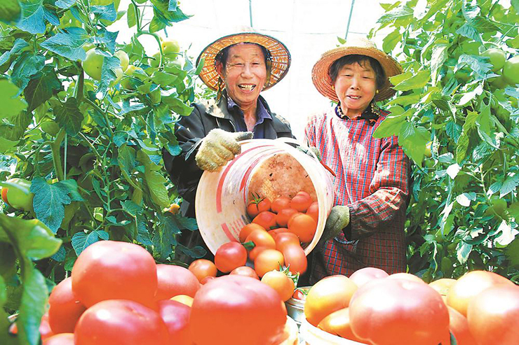 近日,在淮北市相山区渠沟镇钟楼村无公害蔬菜温室大棚种植基地,工人正在收获成熟的优质西红柿,供应长三角市场。