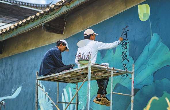 蓝天白云下,三川镇翠湖村,万亩荷塘绿意盎然,一排排灰瓦白墙的民居错落有致。微风拂过白色衣襟,刘志诚正坐在铁架高台上,挥舞手中的画笔,为一幅名为“荷塘戏鱼”的墙绘做最后的收尾。