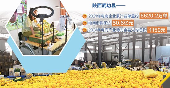 目前,在武功直接与电商相关的人员已有万人,带动就业数万人。王雷说,对于有30多万常住人口的西部县城而言,以农产品精深加工为重点的电商物流已成为“首位产业”,2021年电商产业助力全县人均增收1150元。