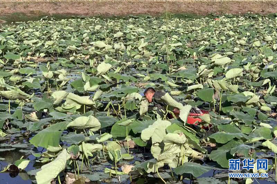 洪湖市黄家口镇新永林村的藕农正在采收藕带。
