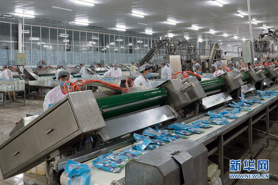 在洪湖市万全镇,湖北华贵食品有限公司的泡藕带加工生产车间一片繁忙景象。一袋袋莲藕产品在流水线上完成打包,然后运往全国各地。