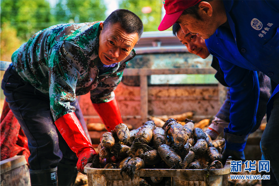藕农正在往加工工厂运送自己采收的新鲜莲藕。