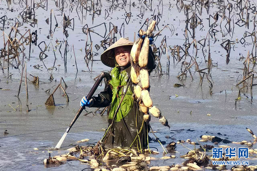 图为藕农在洪湖市雨钱莲藕种植专业合作社的藕田抢抓农时采挖莲藕。
