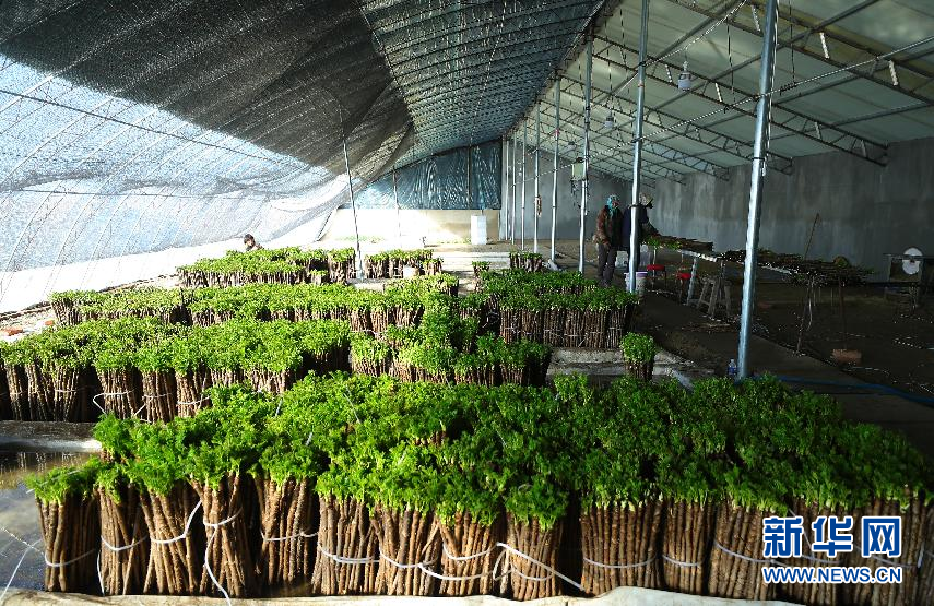 走进沈阳茗源现代农业发展有限公司种植刺嫩芽的大棚,棚里温度适宜,分布着十多个浅浅的水槽,其中几个水槽中生长着一捆捆抽着翠绿的刺嫩芽。