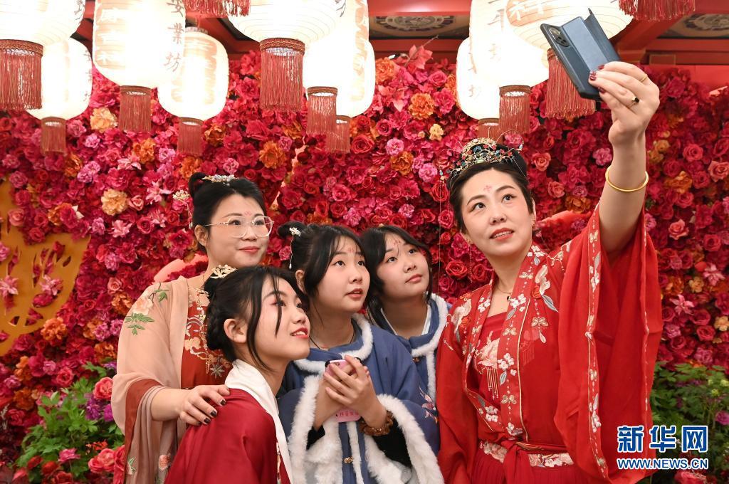 游客身着汉服在西安“长安十二时辰”沉浸式唐风市井生活街区内留影。新华社记者 刘潇 摄