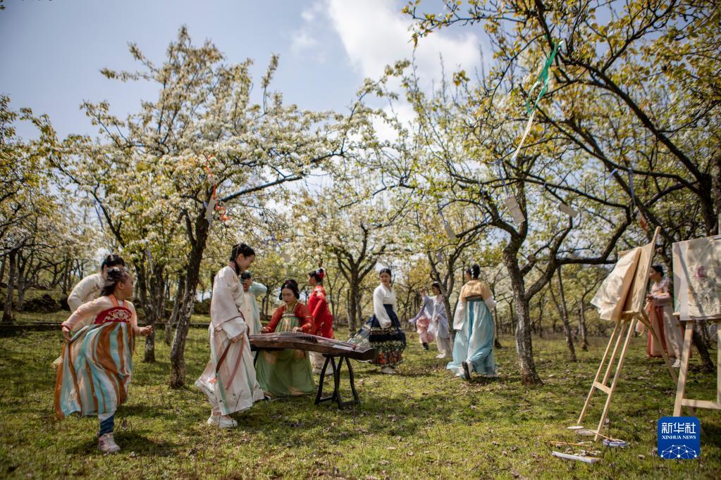 近日,重庆市秀山县溶溪镇梨园村梨花节开幕,两千余亩梨花盛放山野乡间,吸引众多古装爱好者和游客市民前来踏青赏花。走进现场,身着古装的游客们畅游其间,在梨花下演绎出一幅幅动人的古装秀花图。