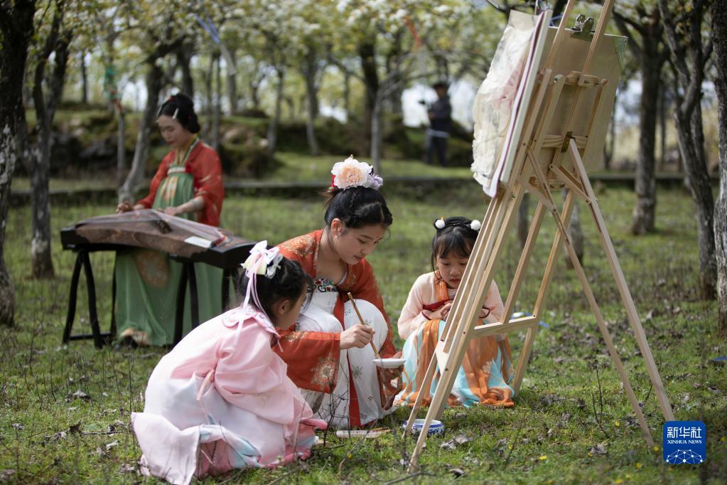 4月1日,一名古装爱好者穿着古装在秀山县溶溪镇梨园村梨树下教小朋友画画。胡程 摄