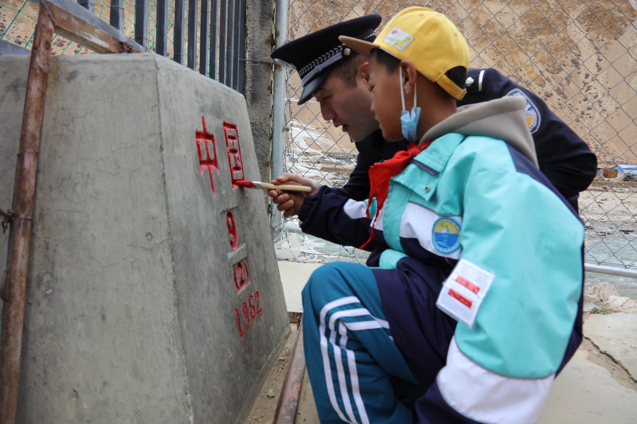 民管理警察和少先队员一起为界桩描红。格热 摄