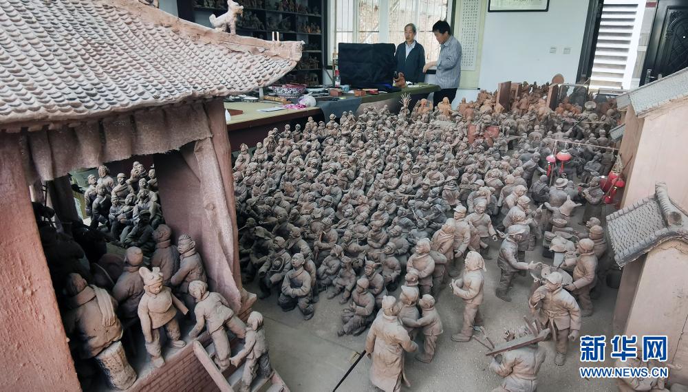 今年72岁的苗春生,从事泥塑50多年,他塑造的一万多个泥塑作品,大多取材于20世纪五十年代至八十年代初期的关中民风民俗、劳动生产场景,有夏收、看大戏、赶集市、闹社火等,场景最多的人物多达千人。他的成就,让他成为陕西省工艺美术大师、陕西省非物质文化遗产传承人。