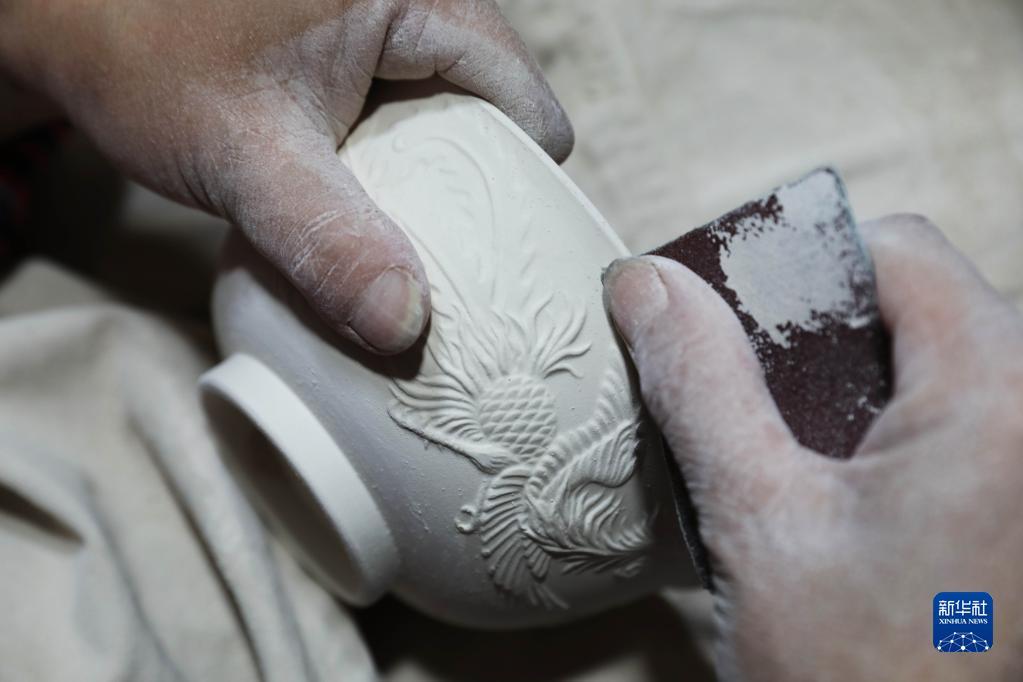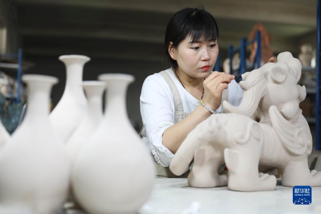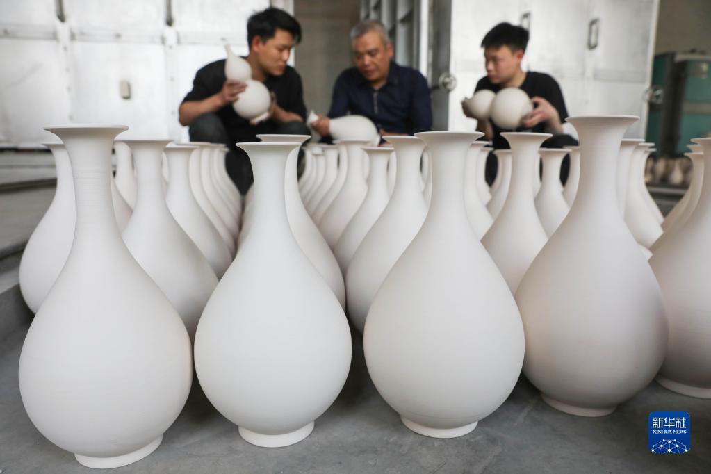 4月19日,在宝丰县一家汝瓷企业生产车间,汝瓷艺人在修饰汝瓷素坯。何五昌 摄