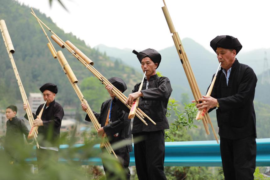 4月22日,新民村村民同外地游客同跳芦笙舞,欢庆高雍苗族“三月三”。