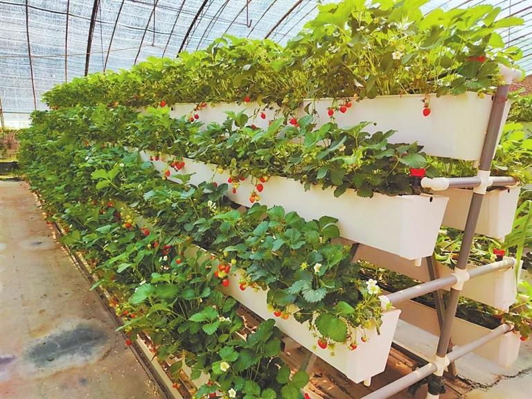 “我这一亩三分地一年产量在5000斤以上。”周明亮说,现在温室大棚里的草莓种植都采用A字高架,在水肥一体化和膜下滴灌技术的加持下,产量比传统的地垄栽培多了四成左右。