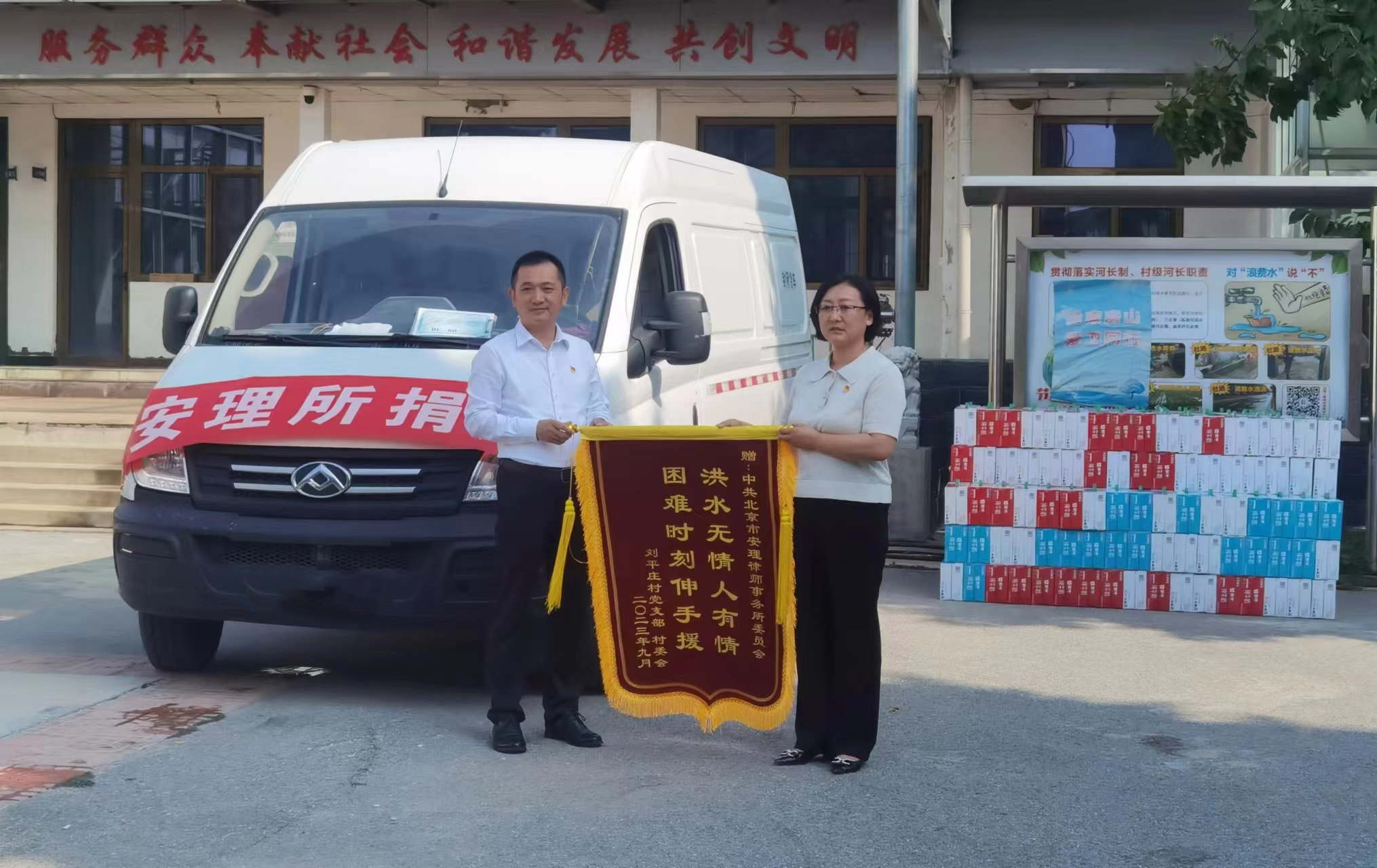 9月1日,中共北京市安理律师事务所委员会(简称“安理党委”)副书记、管委会委员李学辉,党委委员张大军、杨博,管委会秘书陈琛,党务文秘乔雪一行前往北京市房山区窦店镇刘平庄村捐物慰问受灾群众,助力房山灾后重建工作。房山区窦店镇刘平庄村党支部书记王春代表村两委班子接受捐赠。房山区司法局党组成员、副局长温兴善,房山区律师协会会长黄科,房山区律师协会秘书长王恩存一同参加了捐赠活动。