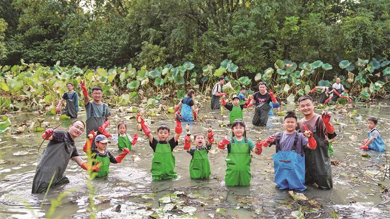 市民在羊尖乡村荷塘体验采藕 刘芳辉 摄