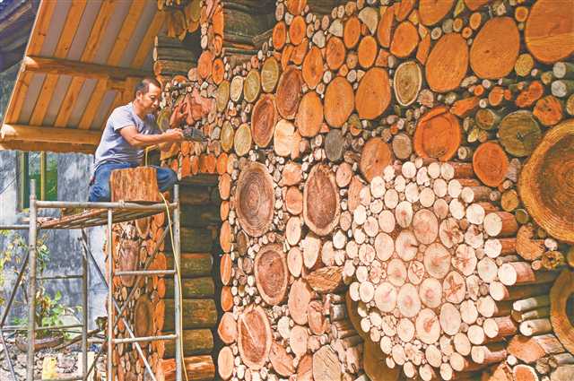 酉阳花田乡何家岩村,工人正在搭建木艺墙,让艺术融入乡村 特约摄影 冉川