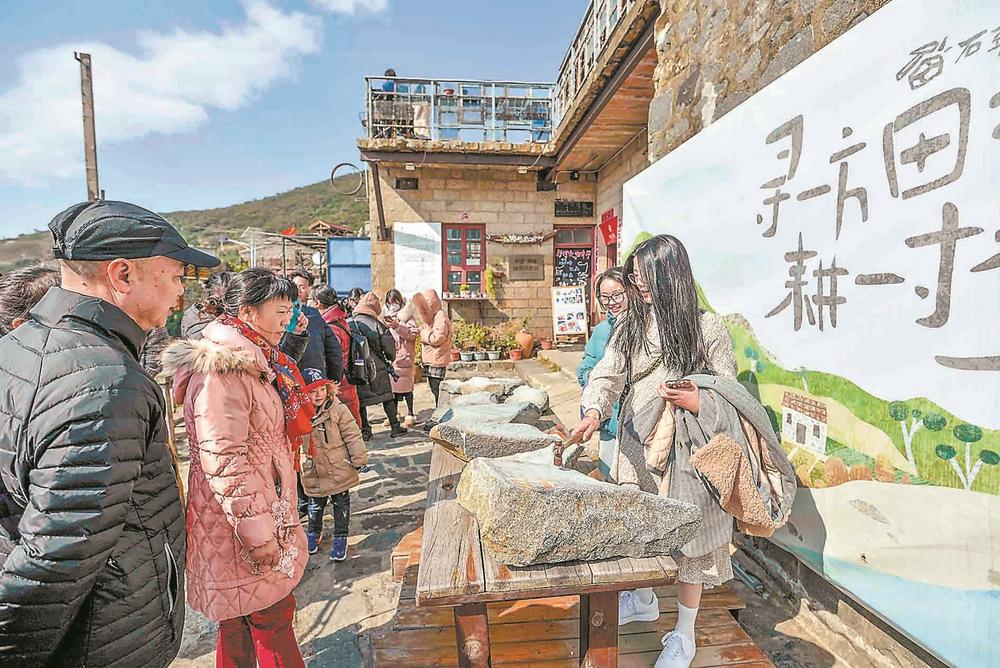 游客在平潭“石头会唱歌”文创工坊前,敲击“会唱歌的石头” 江信恒 摄