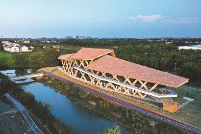 奉贤南桥“乡村最美水岸会客厅”披着金色霞光置身绿野 记者 李茂君 摄