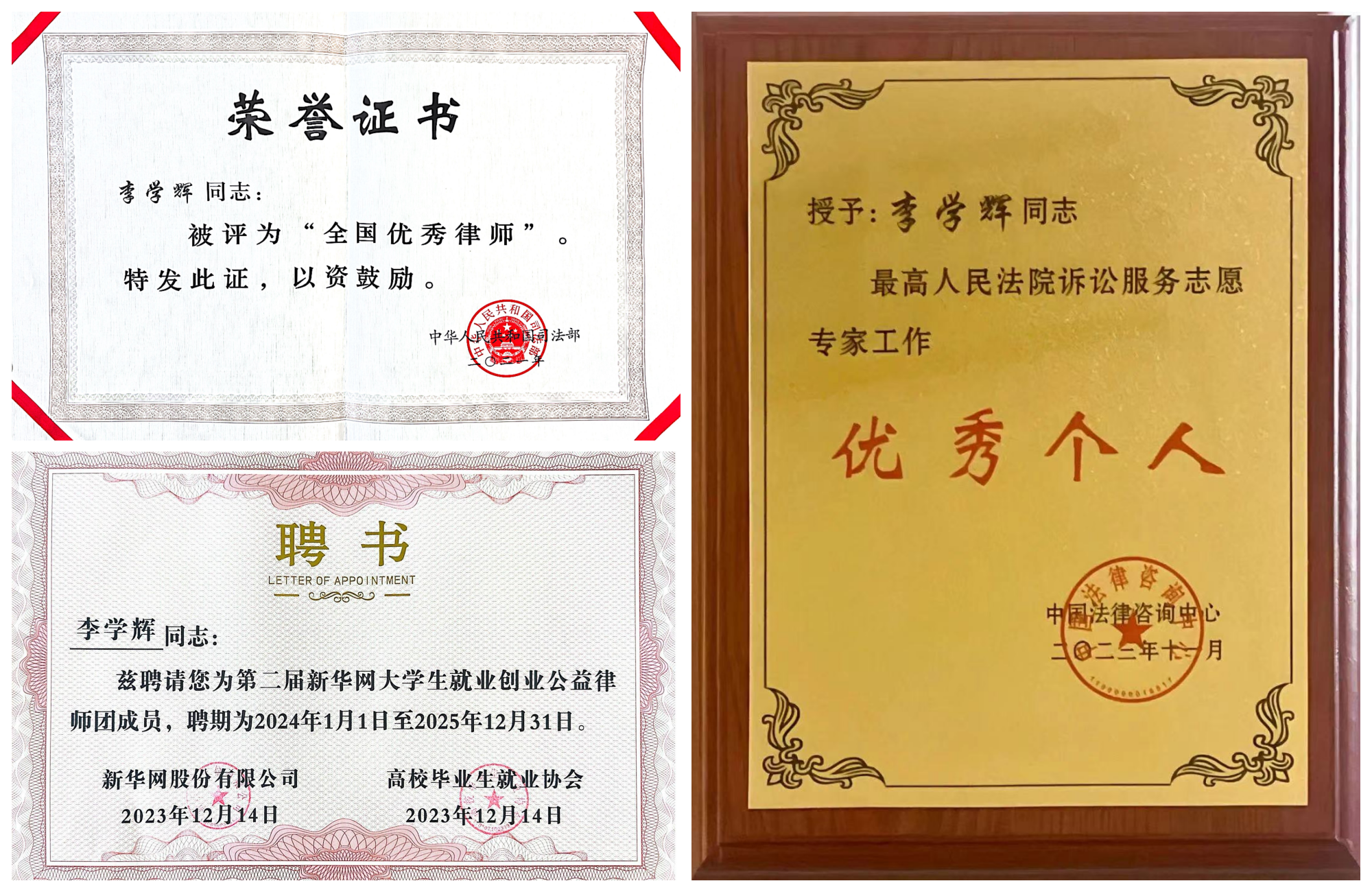 从业逾二十年,得益于过硬的专业能力、较高的学历条件、良好的人际关系和高效的组织能力,李学辉陆续取得一系列的行业职务和社会头衔:海峡两岸法学交流促进会副会长、中国法学会律师法学研究会副会长、北京市朝阳区律师协会副会长、最高人民法院诉讼服务志愿专家、最高人民检察院民事行政案件咨询专家。还获得过全国优秀律师、北京市优秀律师、北京市律师行业优秀共产党员等荣誉。