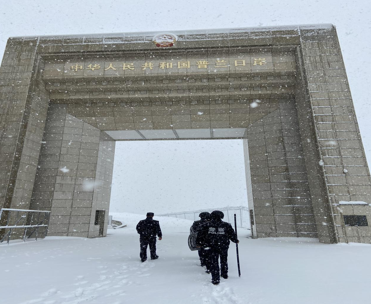 此时,口岸联检大厅外已飘起了大雪,由4名移民管理警察组成的执勤巡逻队正从国门下方缓缓行进,一声声清脆的脚步声,高高飘扬的五星红旗格外醒目。“边境巡逻踏查是我们每天必须完成的任务,不管天气如何,也不管什么日子……”执勤巡逻队长顿珠班典说道。