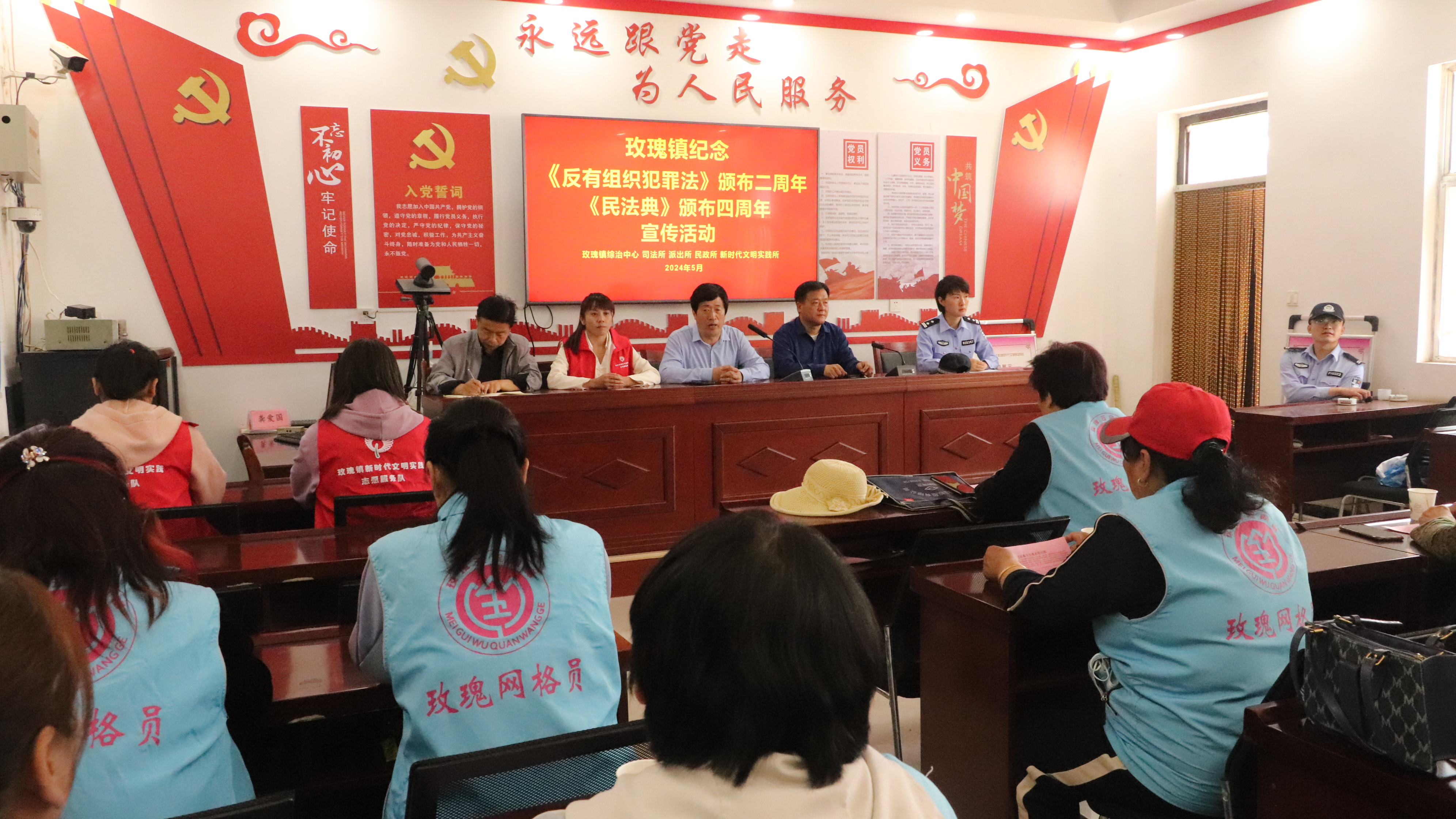 玫瑰拂地红,普法正当时。值《中华人民共和国民法典》颁布四周年、《中华人民共和国反有组织犯罪法》颁布两周年之际,山东省济南市平阴县玫瑰镇综治中心、司法所、派出所、新时代文明实践所、社工站等单位,联合组织开展了“法润百格典亮玫瑰”普法宣传月活动。