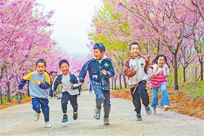 在北湾半岛樱花园,孩子们尽情游玩奔跑 通讯员 李秀珍 摄