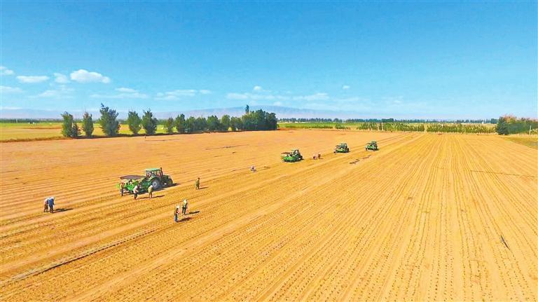 “马铃薯播种机通过GPS定位系统及北斗导航,进行无人驾驶机械化播种,田间起垄像一条条直线,因此,我们随后铺设在马铃薯垄上的滴灌带同样笔直。滴灌带一改过去传统的大水灌溉‘浇地’为‘浇作物’,实现了精准灌溉。”黄羊河农场场长李国忠解释。