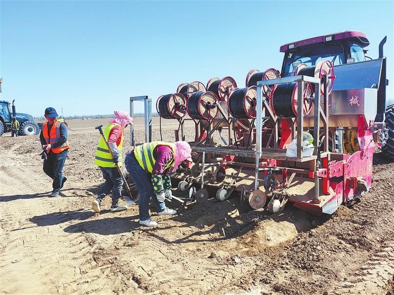 黄羊河农场职工在调试滴灌农机设备 记者 王朝霞