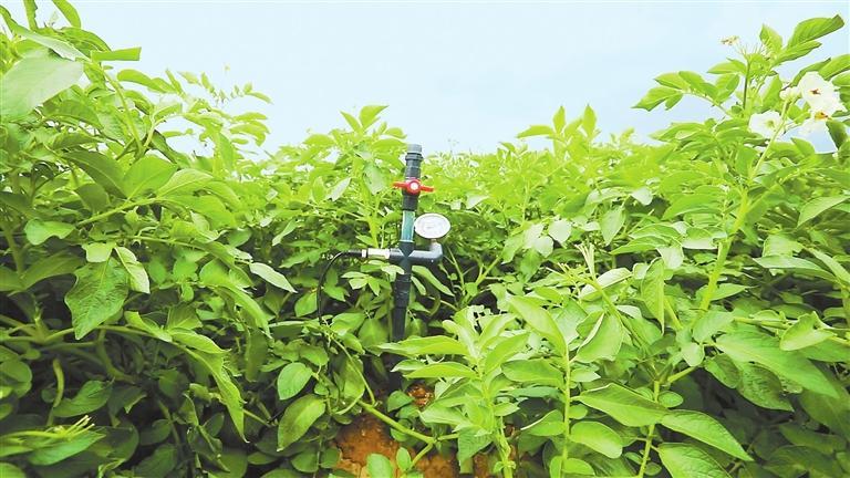 记者随手拎起一条滴灌带,但见黑色的细管上有针眼般大小的小孔。农场职工拿出手机,点击智能化滴灌系统APP,滴灌带发出了“汩汩”水流声,从小孔涌出细细的水珠,渗入地垄里,滋润着马铃薯种子,催其发芽出苗。