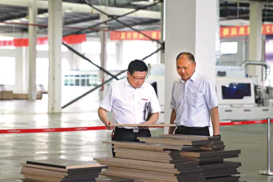 江苏沭阳农商银行董事长陈雷(左)深入板材企业走访调研