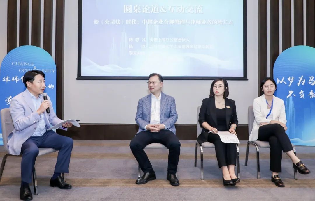 新《公司法》的实施为企业合规管理设置了很多新的课题,亦为律师展业提供了许多新的机会。为此,青年律师该如何“借势”,化挑战为机遇,实现个人成长?围绕此话题,陈欣教授、安理合伙人宇文鸿雁律师、青年律师代表刘豆律师给出了诸多有益建议。陈轶凡律师担任本环节主持。