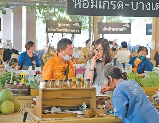 在泰国一家绿色农场内的农产品市场,游客在品尝和购买新鲜有机农产品 记者 白元琪 摄