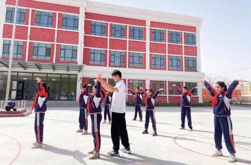 不仅少儿八段锦的练习颇有讲究,看似简单的“啦啦操”也大有门道。在玛合玛勒小学的啦啦操课上,体育老师赵金阁采用分解教学的形式向孩子们讲授动作的发力顺序和动作要领,并让学生们跟着音乐节拍完整练习。“跟着节拍练习既能增加学生上课兴趣,还能帮助学生更快掌握技术要领,做到科学练习。”